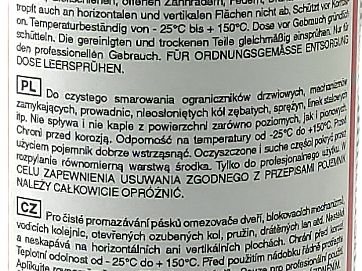 ☑️używany do smarowania mechanizmów zamkowych, prowadnic, sprężyn, otwartych kół zębatych, lin stalowych itp.