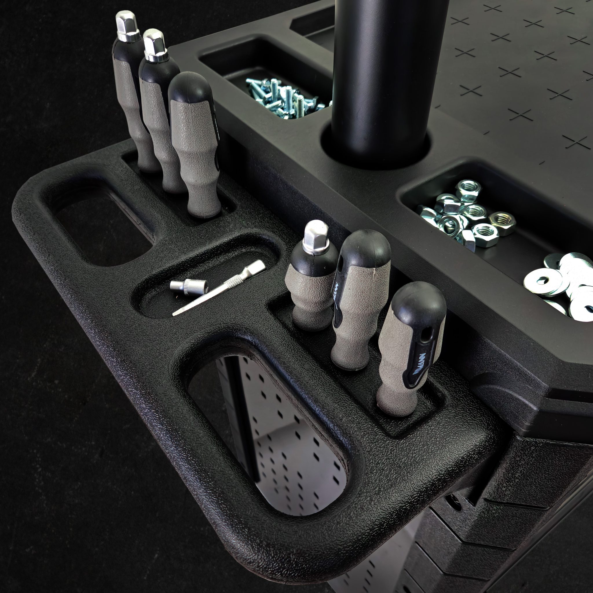 ✅ Blat z wyżłobieniami na butelki i drobne elementy (np. śruby, nakrętki) zapobiegające ich przemieszczaniu się.