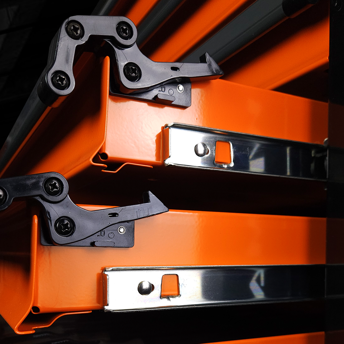 Dzięki zintegrowanemu zamkowi wszystkie 7 szuflad można zablokować jednocześnie, co zapobiega ich przypadkowemu otwarciu podczas przemieszczania szafki. Solidny, stalowy blat roboczy pozwala na wygodne odkładanie często używanych narzędzi. Konstrukcja o podwójnych ściankach, wzmocnienia korpusu oraz prowadnice kulkowe zapewniają płynne i trwałe działanie szuflad.