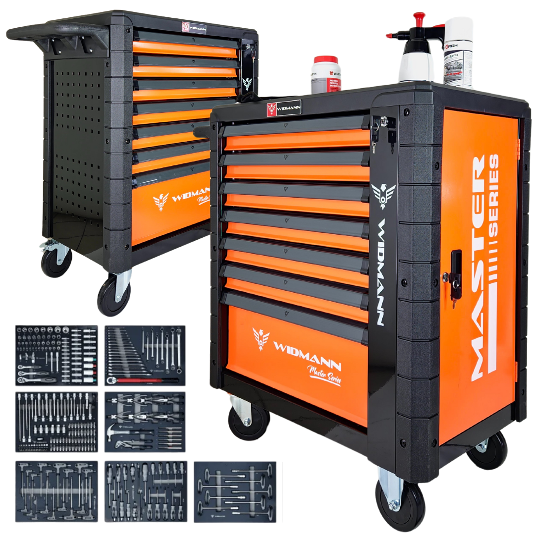 Widmann Master Series to kompaktowa, ale niezwykle funkcjonalna szafka warsztatowa z 7 szufladami, wyposażona w szeroki zestaw wysokiej jakości narzędzi – kluczy nasadowych, płaskich, śrubokrętów, szczypiec i wielu innych niezbędnych akcesoriów. To idealne rozwiązanie do warsztatu, garażu czy domowego kącika majsterkowicza.