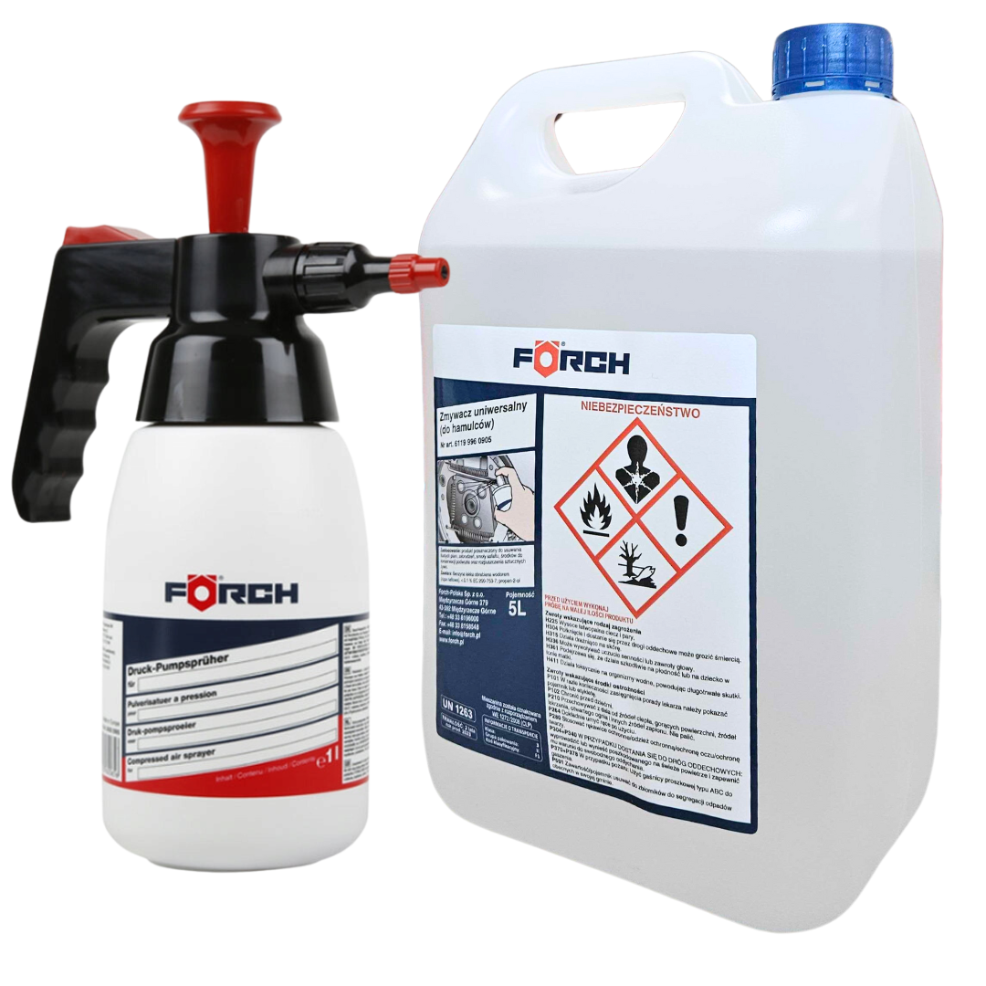 Zmywacz uniwersalny 5L z rozpylaczem ciśnieniowym FORCH 1L. Skuteczne usuwanie oleju, smarów, brudu z układów hamulcowych i części metalowych.